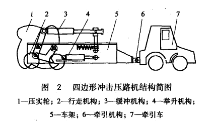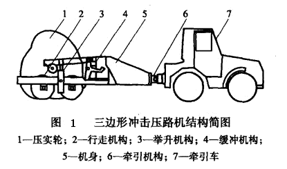 沖擊式壓路機主要依靠碾壓滾輪巨大的慣性沖擊來進行壓實,主要有異形碾壓輪、車架、緩沖機構、牽引機構、舉升機構和行走機構組成。如圖1,它是一種三邊性沖擊式壓路機結構簡圖。圖2所示的是一種四邊形沖擊式壓路機的結構簡圖。