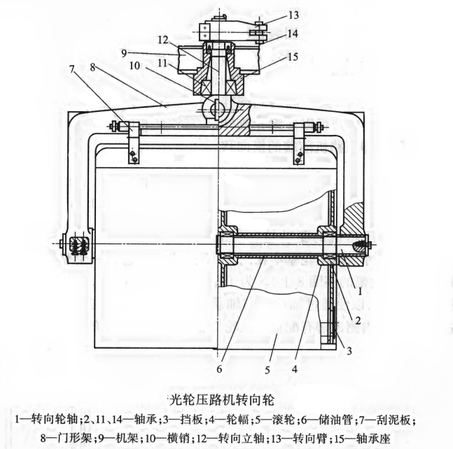 二輪二軸式和三輪二軸式光輪壓路機的轉向輪的機構基本相同,并依靠門形和轉向立軸與機架連接。徐工生產的幾種機型的壓路機的轉向輪與懸架完全相同,也有其他一些產品使用的是三輪二軸式壓路機的懸架為框架式機構。今天我徐工壓路機配件上就來為大家簡單介紹下光輪壓路機的轉向輪及懸架。 徐工光輪壓路機的轉向輪與懸架圖下圖所示,它由滾輪5,軸承2、11、14,門形架8和轉向立軸12等組成。轉向輪由輪圈和輻板焊接而成。為了便于轉向、減小轉向阻力矩,通常將轉向輪分為兩個萬千相同的滾輪,分別用軸承2支撐在轉向軸上。為了潤滑軸承,在輪軸上套裝有儲油管6,其內注入潤滑脂(每年注一次)。輪內可灌砂或水,以調節壓實質量。